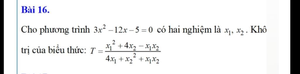 `+)` Theo hệ thức Vi-ét ta có: `x_{1}+x_{2}=-b/a=-\frac{-12}{3}=4`