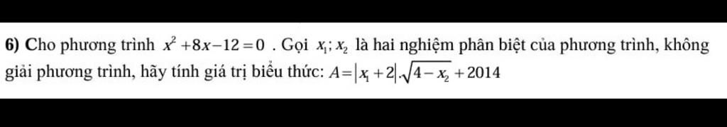 Câu 6: Ta có phương trình:$x^2 +8x-12=0$