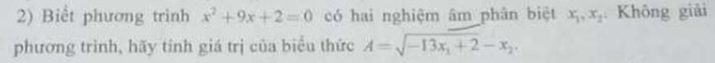 Vì phương trình `x^2 + 9x + 2 = 0` có hai nghiệm âm phân biệt `x_1, x_2` nên theo hệ thức vi - ét, có:
