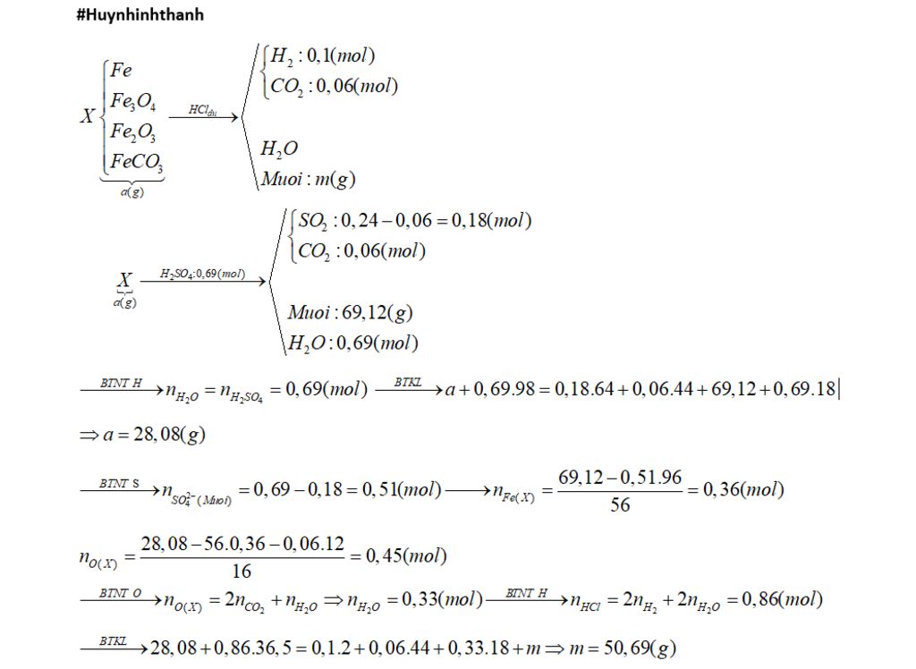 Hòa tan hết a gam hỗn hợp X gồm Fe, Fe₃O₄, Fe₂O₃, FeCO₃ trong dung dịch HCl dư, thu được 3,584 lít (đktc) hỗn hợp khí có tỉ khối so với H₂ bằng 8,875 và dung dịch chứa m gam muối. Mặt khác, nếu hòa tan hết a gam hỗn hợp X trên dung dịch chứa 0,69 mol H2SO4 thì thu được dung dịch chỉ chứa 69,12g hỗn hợp muối sulfate và 5,376 lít (đktc) hỗn hợp gồm 2 khí (có 1 khí là SO2 ).Tính m