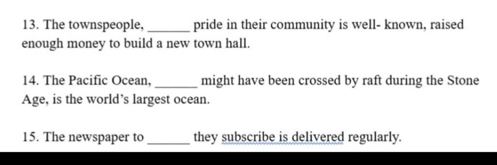 13. The townspeople, whose pride in their community is well-known, raised enough money to build a new town hall.