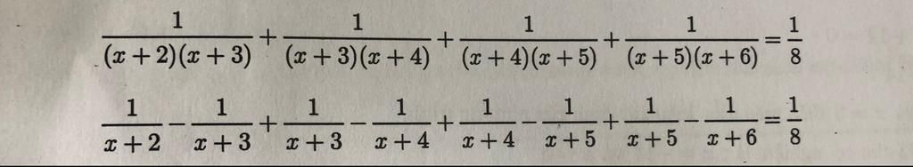 `1/((x+5)(x+6))=((x+6)-(x+5))/((x+5)(x+6))=1/(x+5)-1/(x+6)`