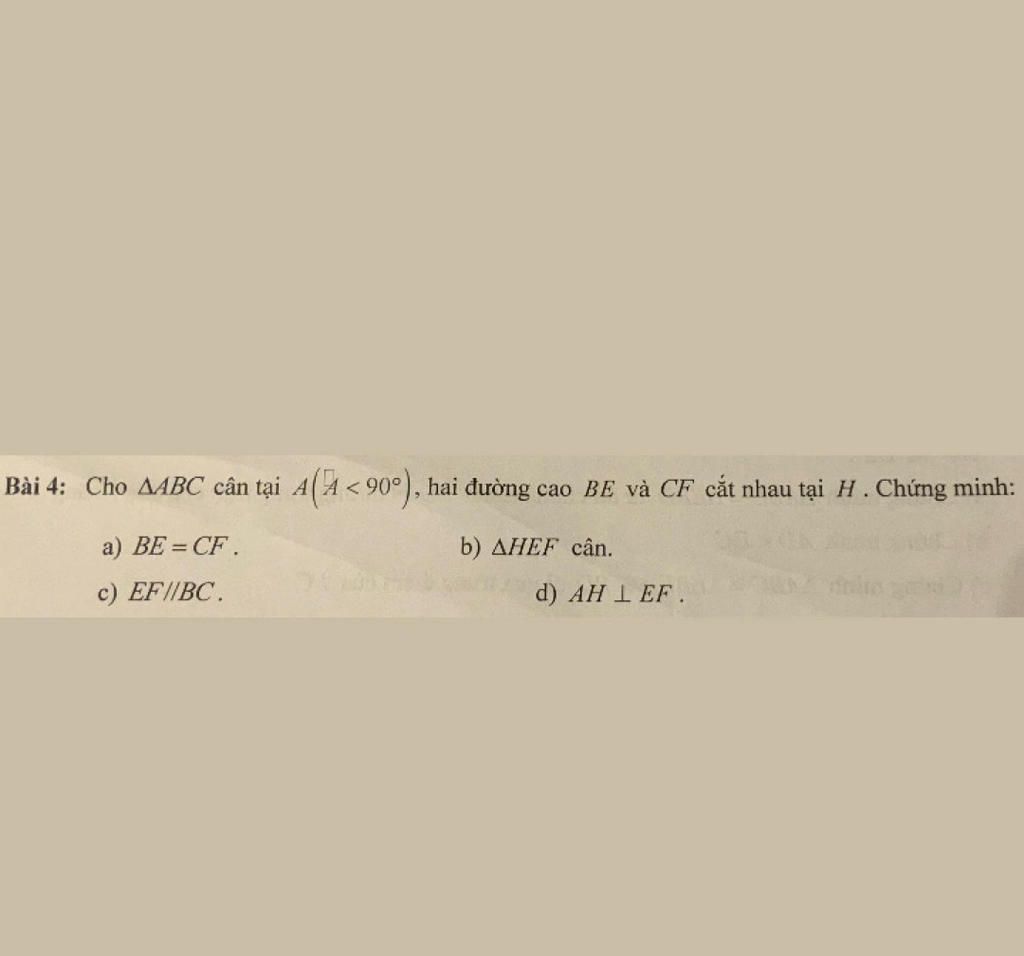 `a)` Xét `Delta AEB` vuông tại `E` và `Delta AFC` vuông tại `F` ta có: