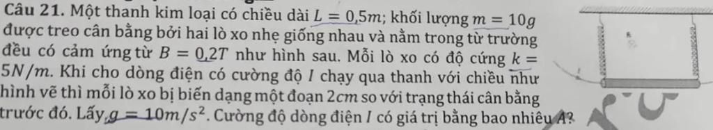 Đáp án: 2 đáp án tùy vào F đàn hồi của bạn cho nó hướng lên hay hướng xuống . Tổng hợp lực : vecto 2Fđh + vecto P + vecto F lực từ = vecto 0