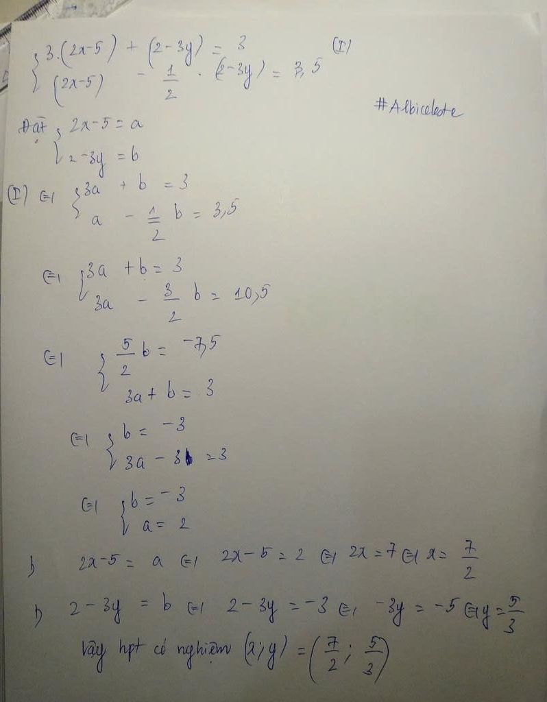 Đặt: `a=2x-5` và `b=2-3y` ta được hệ: