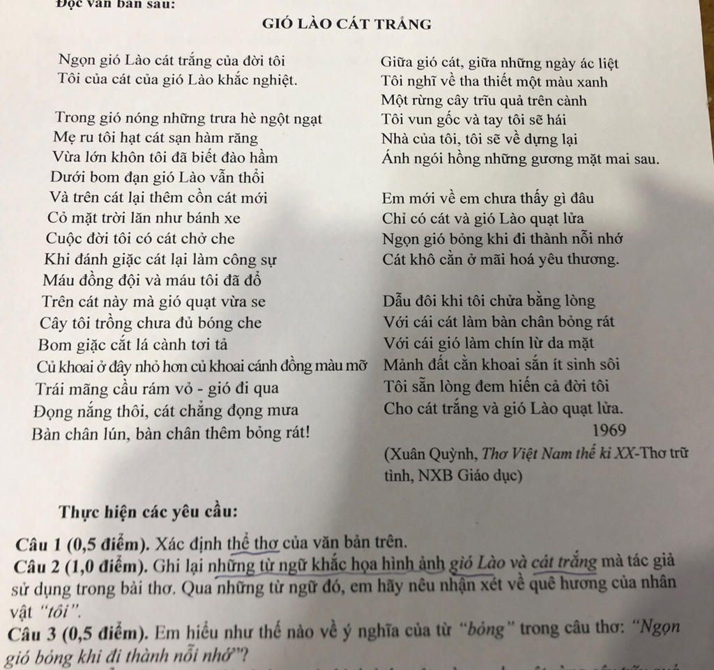 `-` Nhận xét: Bài thơ “Gió Lào cát trắng” được Xuân Quỳnh sáng tác năm 1969, trong giai đoạn đất nước đang chìm trong khói lửa chiến tranh. Bài thơ là tiếng lòng sâu lắng và tha thiết của nhân vật "tôi". Quê hương của nhân vật “tôi” hiện lên như một miền đất khắc nghiệt nhưng đầy kiêu hãnh nơi gió Lào như lửa, cát trắng như tro phủ kín từng bước chân người đi. Tuy vậy, giữa cái khô cằn và bỏng rát ấy, vẫn bừng sáng một tình yêu tha thiết đó là tình yêu quê hương gắn liền với máu thịt, với những khát vọng bình yên và màu xanh của hy vọng.