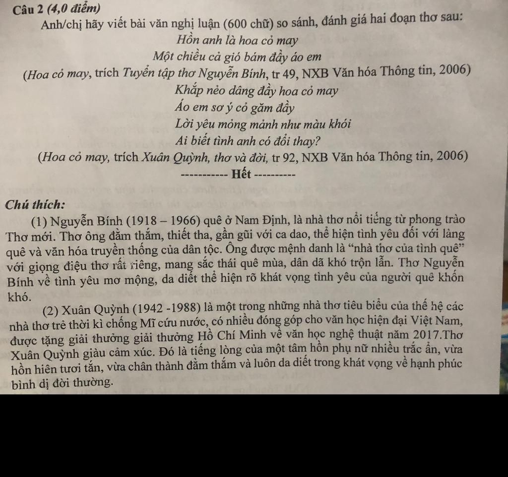Anh/chị hãy viết bài văn nghị luận (600 chữ) so sánh, đánh giá hai đoạn thơ sau: