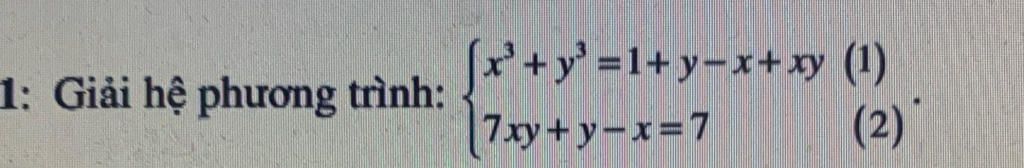Ta có: `{(x^3 + y^3 = 1+ y -x + xy (1)),(7xy + y -x = 7 (2)):}`
