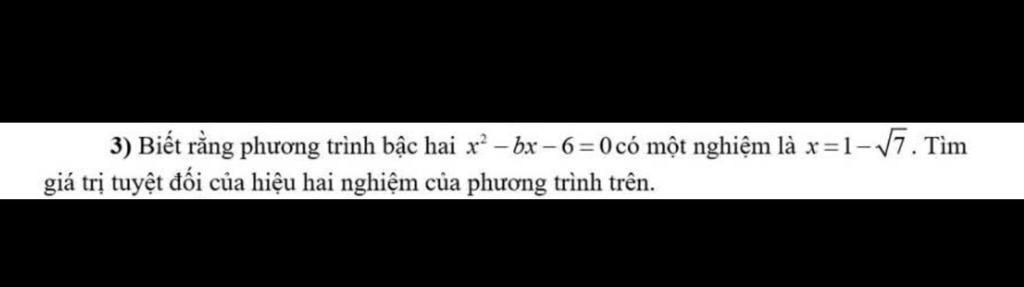 Gọi hai nghiệm của phương trình `x^2 - bx - 6 = 0` là `x_1`; `x_2`. Trong đó: `x_1 = 1 - sqrt(7)`