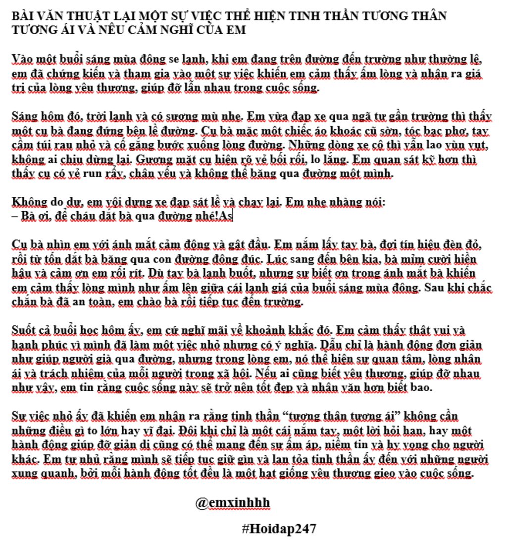 Viết bài văn thuật lại 1 sự việc thể hiện tinh thần tương thân tương ái và chiến dịch suy nghĩ cảm xúc của em về sự việc đó( ví dụ việc giúp đỡ người già qua đường)