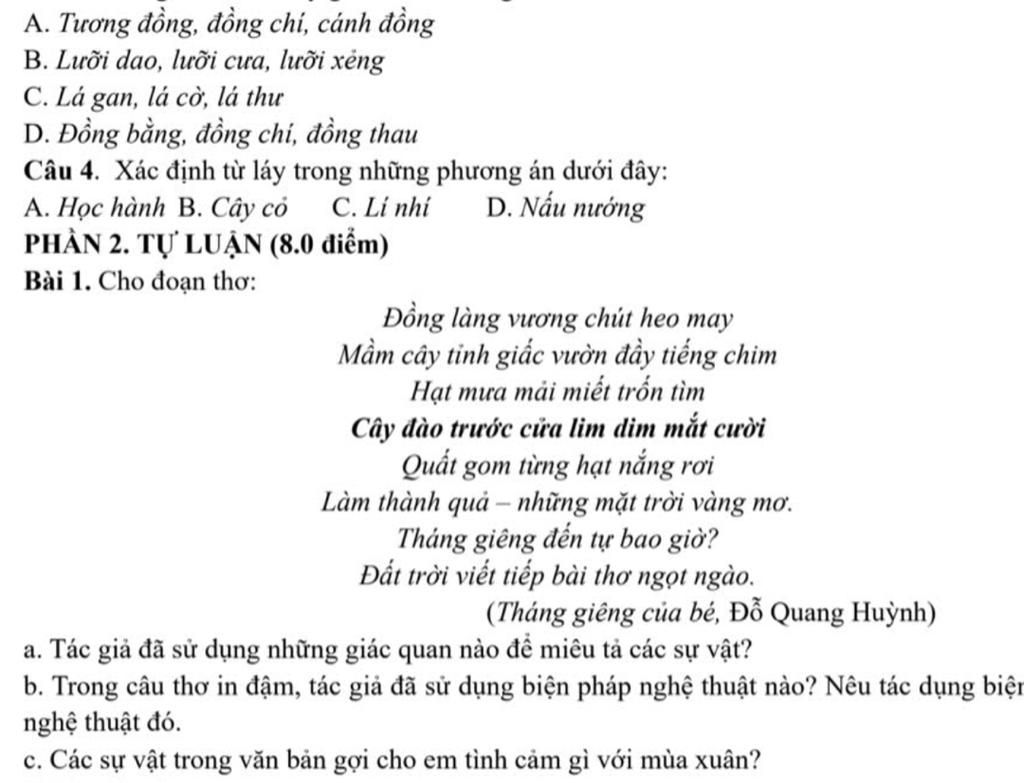 ° Thính giác ( tai nghe ) qua câu thơ là " Mầu cây tỉnh dậy vườn đầy tiếng chim "