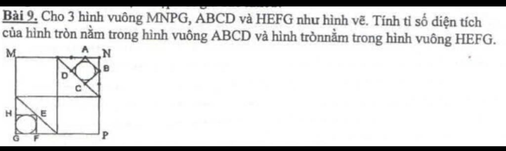 Vậy tỉ số diện tích hai hình tròn nằm trong hình vuông ABCD và hình tròn nằm trong hình vuông HEFG bằng `1`.