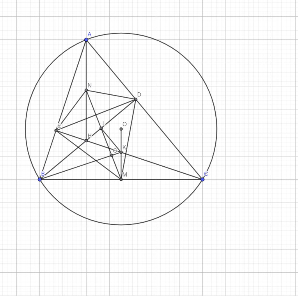 Cho tam giác ABC nhọn nội tiếp đường tròn . các đường cao bd và ce cắt nhau tại H . Gọi M , N là trung điểm BC và AH . Gọi K ,L lần lượt là giao điểm hai đường thẳng OM và CE , MN và BD. Gọi G là giao điểm KB, LM . Chứng minh GL.GM=GK.GB