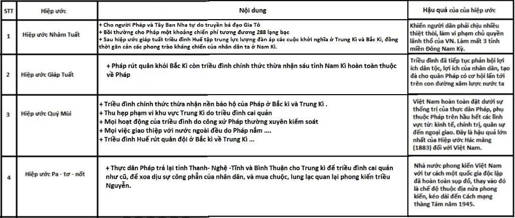 4 hiệp ước: Hiệp ước Nhâm Tuất, hiệp ước Giáp Tuất, hiệp ước Hac-măng và Pa-tơ-nốt