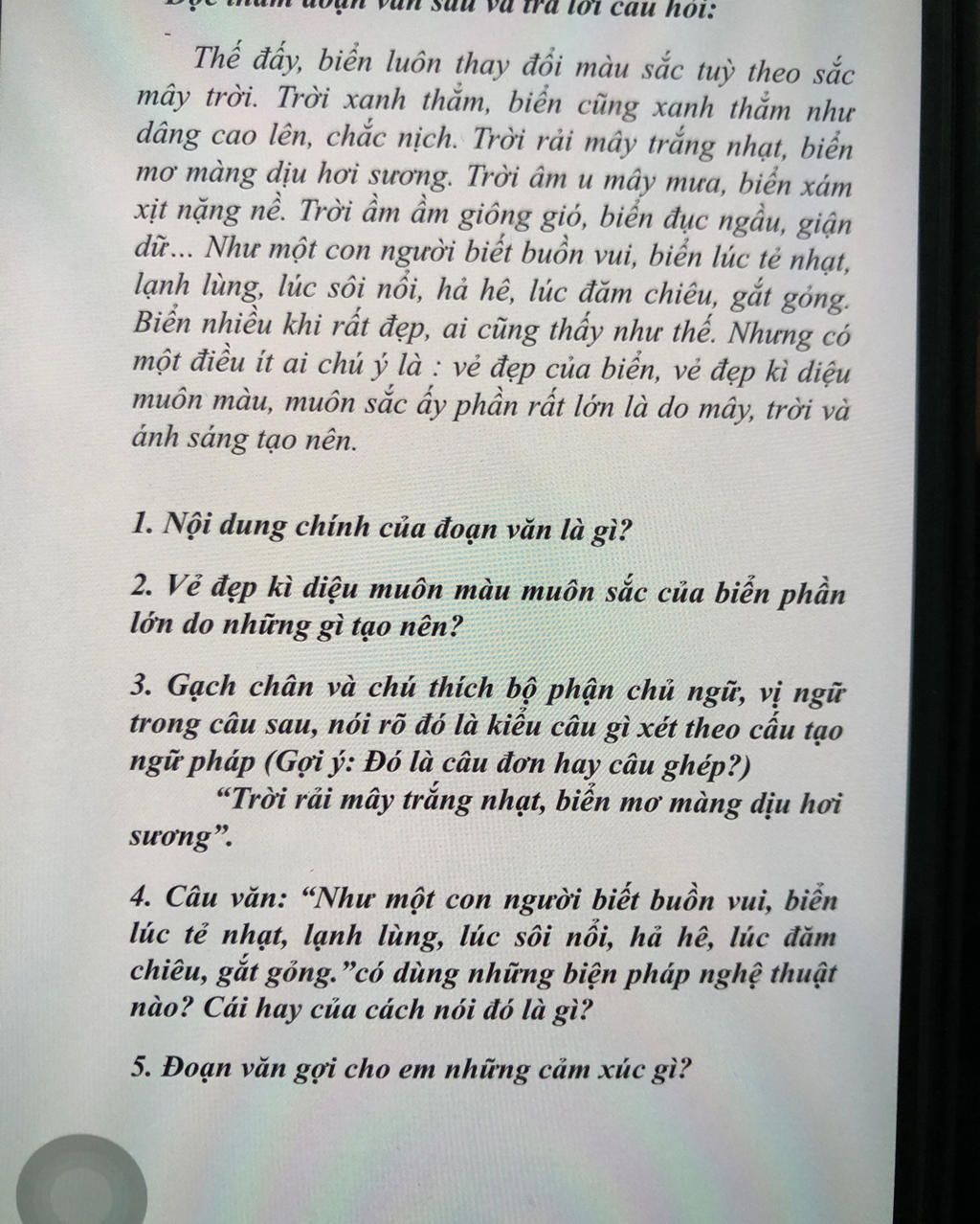 1. Nội dung chính của đoạn văn: miêu tả các trạng thái , màu sắc và vẻ đẹp kỳ diệu, muôn màu của biển theo sắc mây trời.