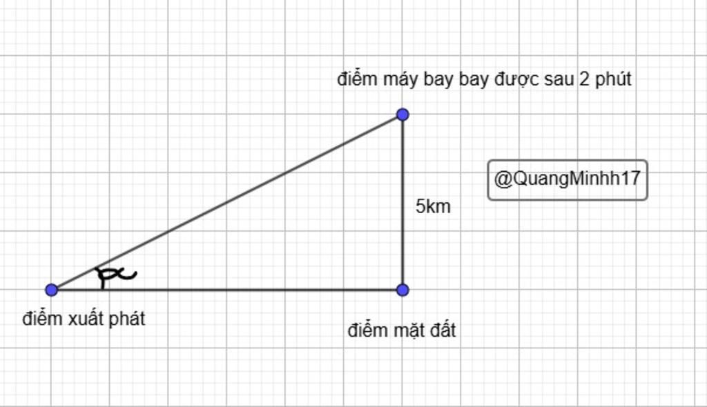 Gọi số đo của góc được tạo thành từ đường bay lên của máy bay với phương nằm ngang là `\alpha`