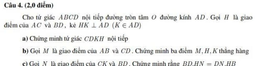 b) Gọi M là giao điểm của AB và CD . Chứng minh ba điểm M, H, K thẳng hàng
