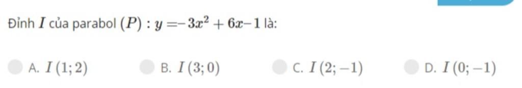Đỉnh `I` của parabol là: `( -b/(2a) ; ( -Δ )/( 4a )) = ( 1 ; 2 )`
