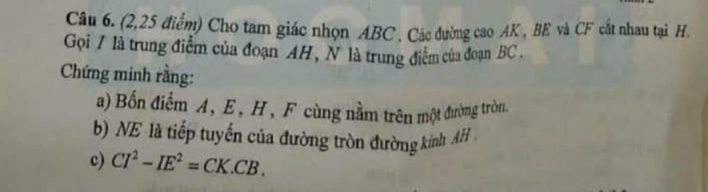 Ta có: $\Delta BEC$ vuông tại $E, N$ là trung điểm $BC$