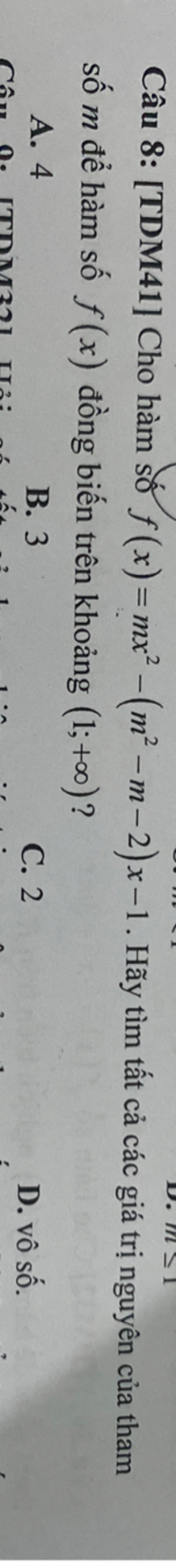 Với `m \ne 0 to f'(x) = 2xm - (m^2 - m - 2) \ge 0 AA x \in (1 ; +oo)` và `m > 0`