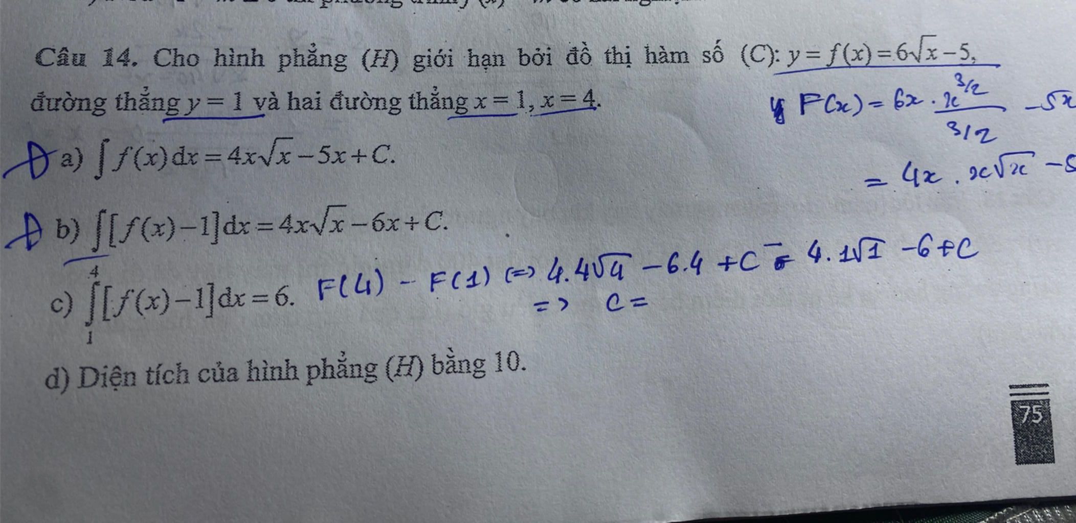 Ta có : `\int_1^4 [f(x) - 1] dx = F(4) - F(1)`