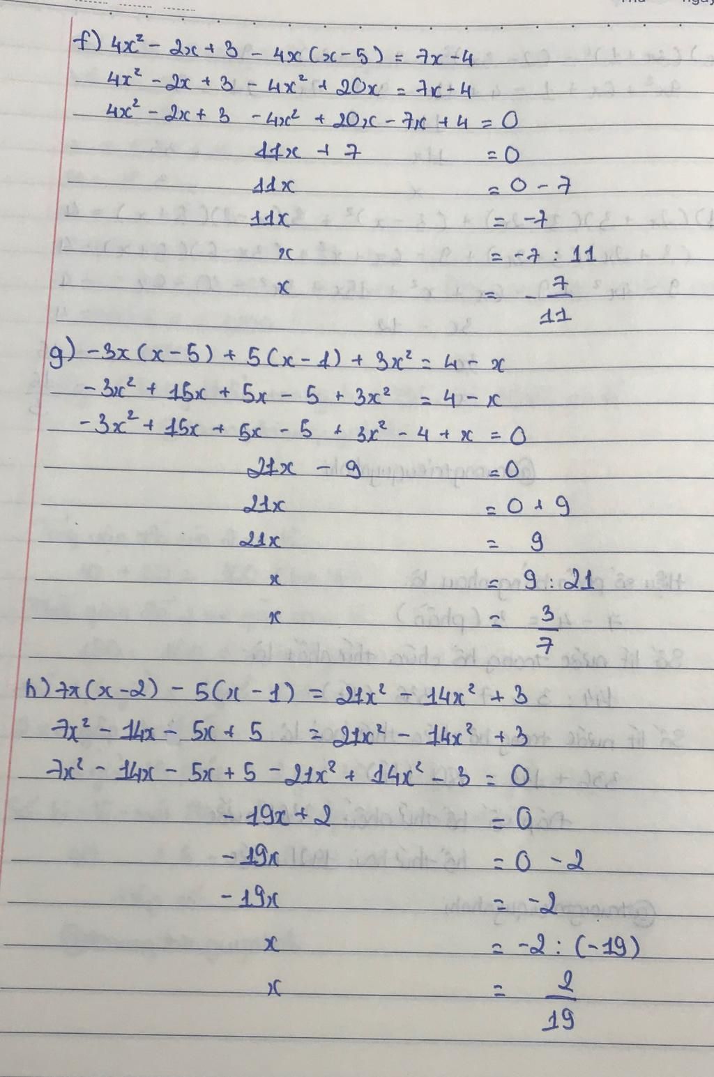 `h)` `7x(x-2)-5(x-1)=21x^2-14x^2+3`