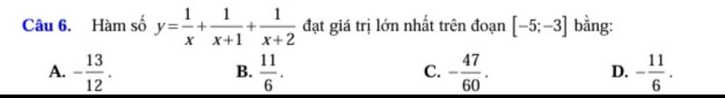 `->y_(max)` trên `[-5;-3]` là `y(-5)=1/(-5)+1/(-5+1)+1/(-5+2)=-47/60`