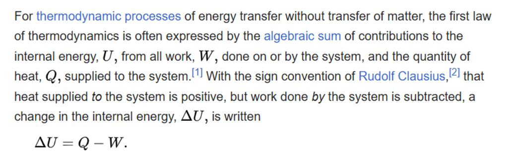 With the sign convention of Rudolf Clausius, that heat supplied to the system is positive, but work done by the system is subtracted là `:` Với quy ước về dấu hiệu của Rudolf Clausius, nhiệt lượng cung cấp cho hệ thống là dương, nhưng công mà hệ thống thực hiện sẽ bị trừ đi