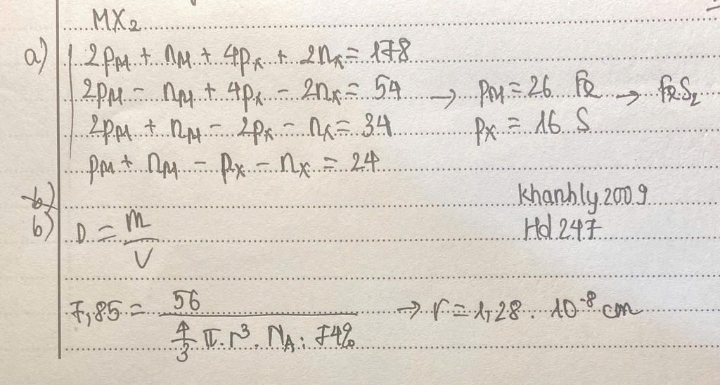 Từ một loại quặng phổ biến, người ta tách ra được hợp chất vô cơ MX₂. Trong phân tử MX₂ có: Tổng số hạt proton, neutron, electron bằng 178 hạt. Số hạt mang điện (proton + electron) nhiều hơn số hạt không mang điện (neutron) là 54 hạt. Tổng số hạt proton, neutron, electron trong nguyên tử M lớn hơn trong nguyên tử X là 34 hạt. Tổng số hạt proton và neutron của nguyên tử M lớn hơn của nguyên tử X là 24 hạt. a) Xác định công thức hợp chất MX₂. Ở 20°C, tinh thể kim loại M có: Khối lượng riêng: 7,85 g/cm³. Giả thiết: Các nguyên tử M là hình cầu chiếm 74% thể tích tinh thể, phần còn lại là khe rỗng. b) Tính bán kính (cm) của nguyên tử M ở 20°C.