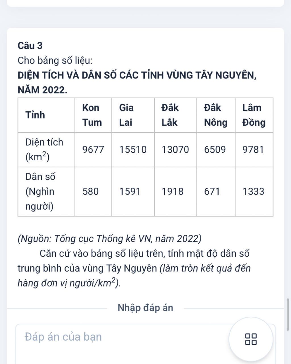 Mật độ dân số trung bình của vùng Tây Nguyên là: