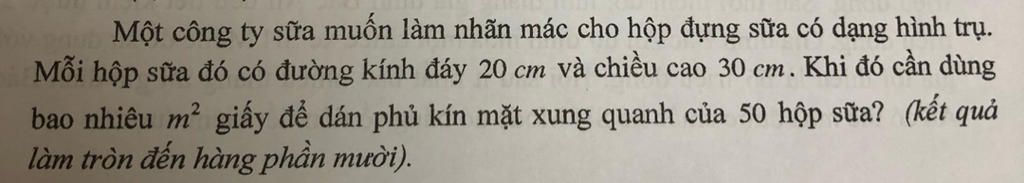 Vậy: Diện tích giấy cần dùng để phủ kín các mặt xung quanh của 50 hộp sữa là `9,4m^2`