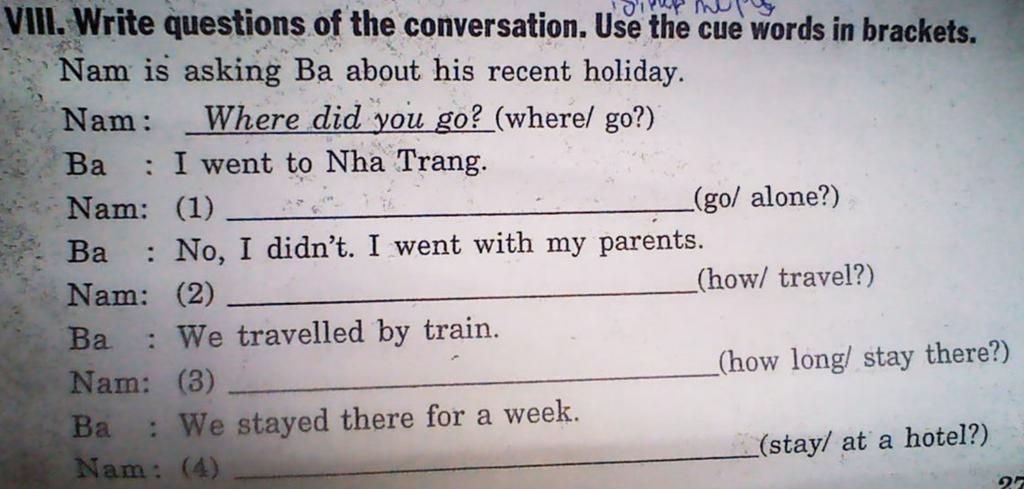 viết câu hỏi của cuộc trò chuyện. Sử dụng gợi ý các từ trong ngoặc