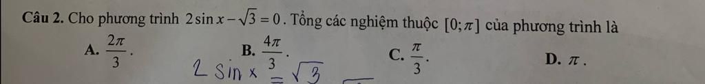 Tổng các nghiệm: `T=[pi]/3+[2pi]/3=pi`