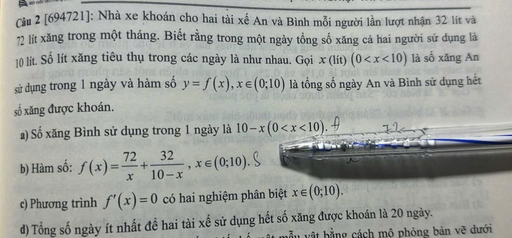 Tổng số ngày An và Bình xử dụng là: `32/x+72/(10-x)` (ngày).