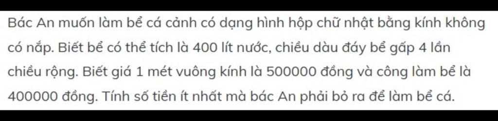 Vậy bác An cần bỏ ra ít nhất `1900000` đồng để làm bể cá có chiều rộng `0,5 m`, chiều dài `2m` và chiều cao `0,4m`