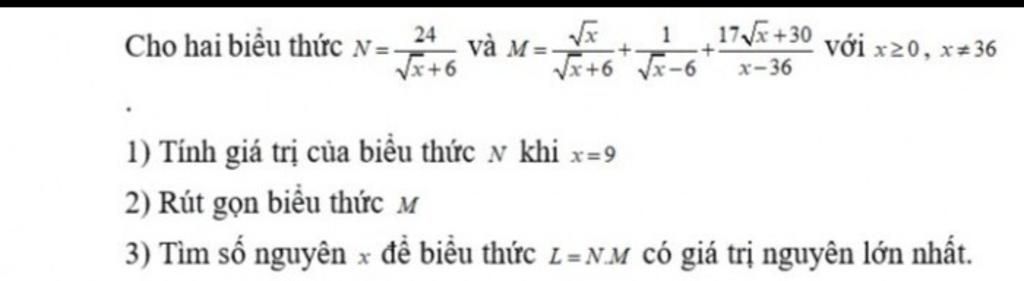 $\sqrt{x} - 6 = 1 \implies \sqrt{x} = 7 \implies x = 49$ (thỏa mãn điều kiện). Khi đó $L = \frac{24}{1} = 24$.