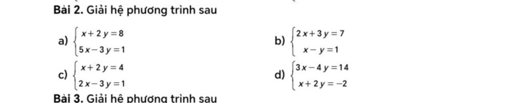 `d,` $\begin{cases} 3x-4y=14 (1)\\x+2y=-2 (2) \end{cases}$