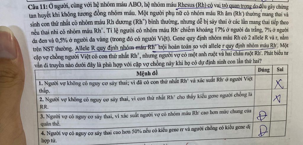 - Trong quần thể chỉ có 0,5% người da vàng có nhóm máu Rh- → Người vợ nằm trong số ít đặc biệt nên xác suất có nhóm máu Rh- cao hơn chung quần thể