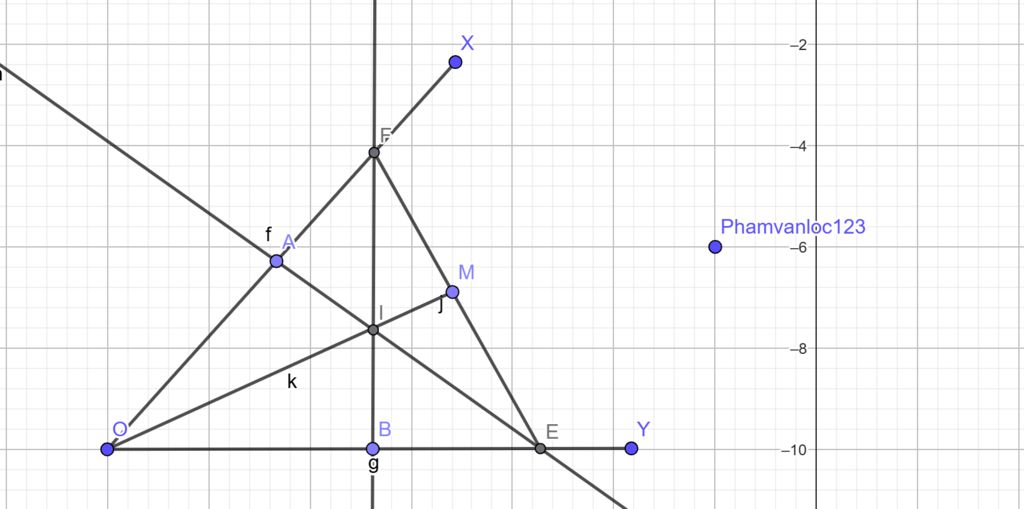 Cho ∠xOy là góc nhọn. Trên tia Ox lấy điểm A ( A≠O ). Trên tia Oy lấy điểm B sao cho OA=OB. Từ A kẻ đường thẳng vuông góc với OA, cắt Oy tại E. Từ B kẻ đường thẳng vuông góc với OB, cắt Ox tại F. a) Chứng minh △OAE=△OBF, từ đó suy ra OE=OF. b) Gọi I là giao điểm của AE và BF. Gọi M là trung điểm của EF. So sánh EM và EI+IFphần 2. c) Chứng minh ba điểm O, I, M thẳng hàng.