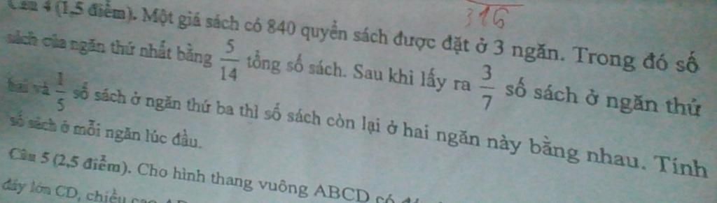 `4/7`(số sách ở ngăn thứ hai)`=4/5`(số sách ở ngăn thứ ba)