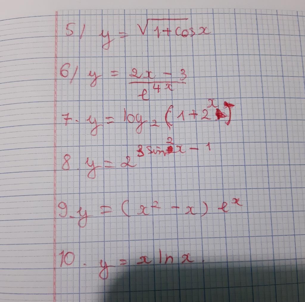 $y'\\=(\sqrt{1+\cos x})' \\=\dfrac{1}{2\sqrt{1+\cos \left(x\right)}}\left(1+\cos \left(x\right)\right)'\:\\=\dfrac{1}{2\sqrt{1+\cos \left(x\right)}}\left(-\sin \left(x\right)\right)\\=-\dfrac{\sin \left(x\right)}{2\sqrt{1+\cos \left(x\right)}}$