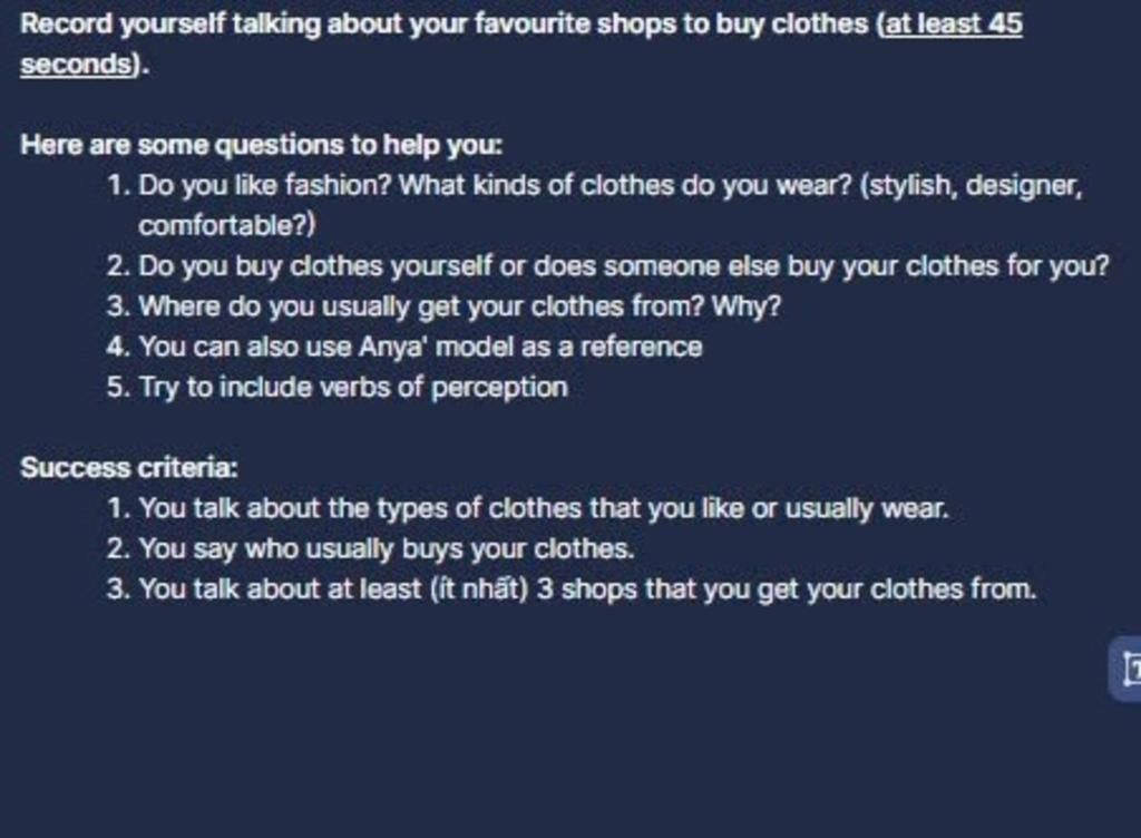 I really like fashion. I enjoy wearing clothes that are both comfortable and nice. On normal days, I usually wear jeans, T-shirts, and sports shoes because they are easy to move in. When I go to school, I wear my uniform. But when I go out with friends, I like to wear something more stylish, like a shirt or a dress.Most of the time, I buy my clothes by myself, especially when I go to the mall with my friends. But sometimes, my mom buys clothes for me, especially when there are sales or when I’m busy.There are three shops I like to buy clothes from. The first one is (Cái gì tùy bn). I like (cái gì tùy bn) because they have many different styles, and the clothes are not too expensive. The second one is (cái gì tùy bn). Their clothes are very simple, but they are good quality and very comfortable. I really like their jackets and sweaters. The third place I often go to is a local shop near my house. It’s not big, but the clothes there look beautiful and the price is cheap. The shopkeeper is also very kind and helpful.I think these shops are great because the clothes look nice, feel good when I wear them, and the prices are okay. When I wear clothes from these shops, I feel more confident and happy.