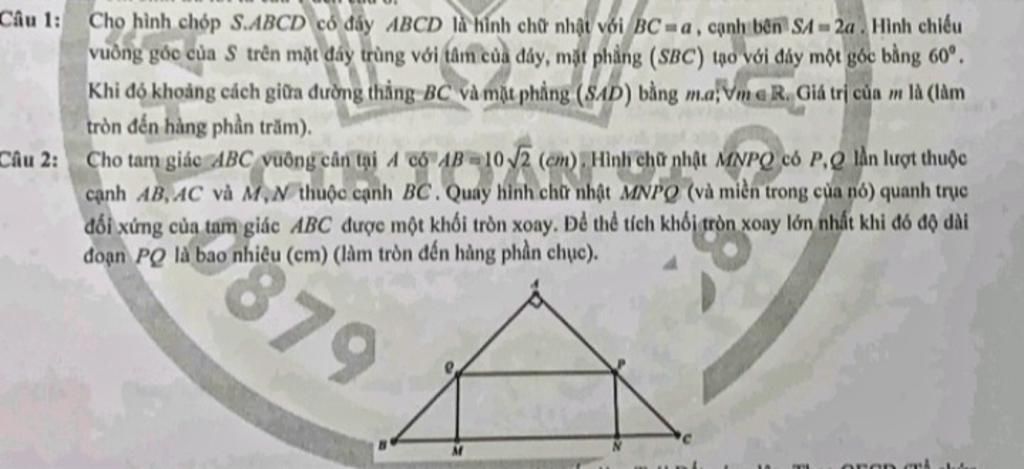 Vậy để thể tích khối tròn xoay lớn nhất thì `PQ` có độ dài xấp xỉ `13,3` cm
