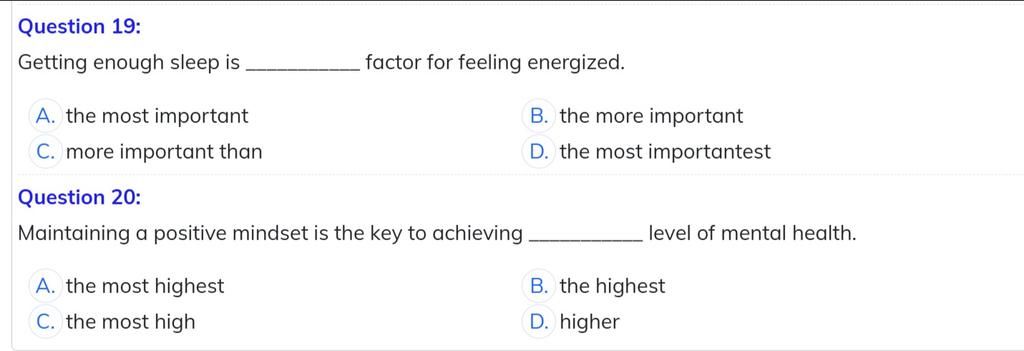 20. chọn B vì "high" là từ có 1 âm tiết nên cần thêm "est" vào đuôi thêm "the" phía trước