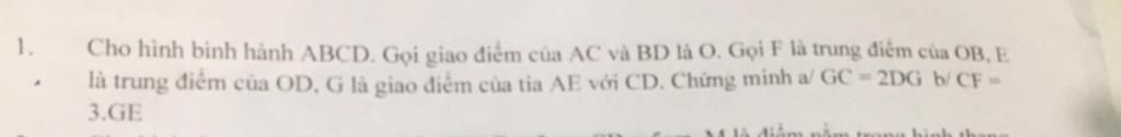 Cho hình bình hành ABCD. Gọi giao điểm của AC và BD là O. Gọi F là trung điểm của OB, E
