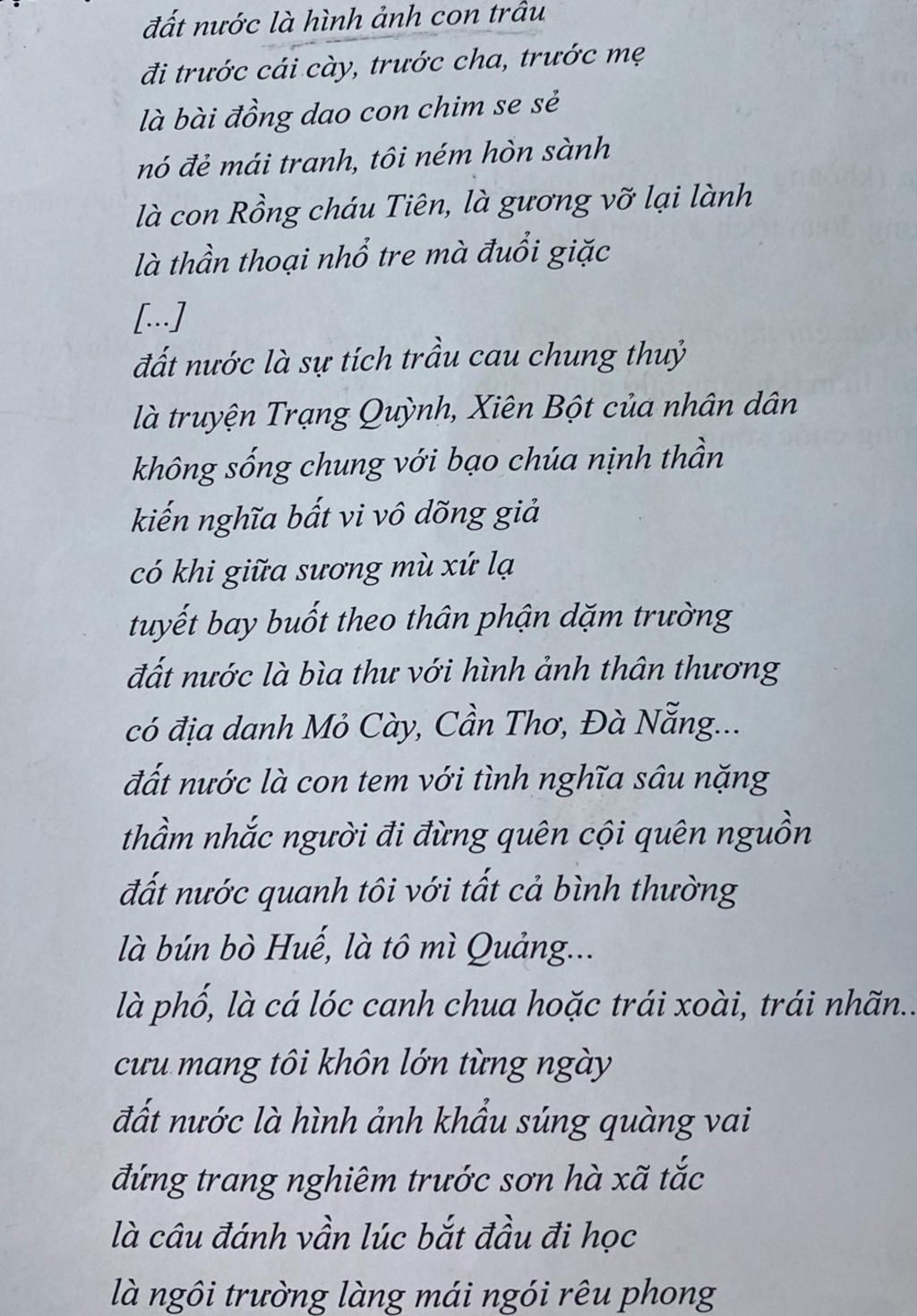Hình ảnh đất nước được cảm nhận qua lăng kính gần gũi, thân thương và đầy tự hào của nhân vật trữ tình. Đất nước không chỉ là khái niệm địa lý hay chính trị mà hiện lên từ những điều bình dị, thân quen trong đời sống hằng ngày: là con trâu đi trước cái cày, là bài đồng dao, là truyện cổ dân gian như Trạng Quỳnh, Xiên Bột, là những món ăn dân dã như bún bò Huế, tô mì Quảng. Đất nước còn là tinh thần bất khuất, nghĩa khí của dân tộc: "không sống chung với bạo chúa nịnh thần", là “kiến nghĩa bất vi vô dòng giả”. Qua đó, nhân vật trữ tình thể hiện niềm tự hào sâu sắc với truyền thống văn hóa, lịch sử và con người Việt Nam. Những hình ảnh ấy tạo nên một đất nước vừa gần gũi, thân thuộc, vừa linh thiêng, vĩ đại. Đặc biệt, đất nước không tách rời mà gắn bó với mỗi con người, hiện diện trong từng kí ức, món ăn, câu chuyện, bài học, khiến mỗi cá nhân cảm nhận rõ vai trò của mình trong việc gìn giữ và xây dựng đất nước.
