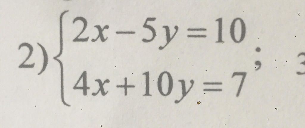 `{( 2x - 5y = 10 ( 1 ) ),( 4x + 10y = 7 ( 2 )):}`