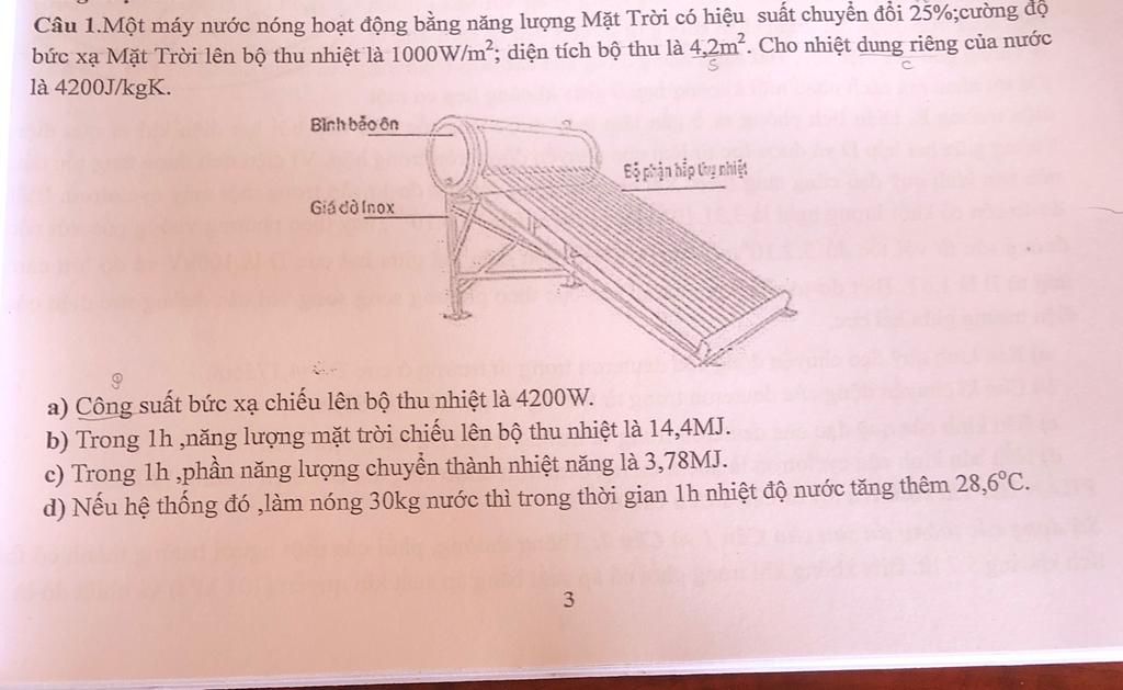 Công suất bước xạ chiếu lên bộ thu nhiệt là: `1000*4,2=4200W`