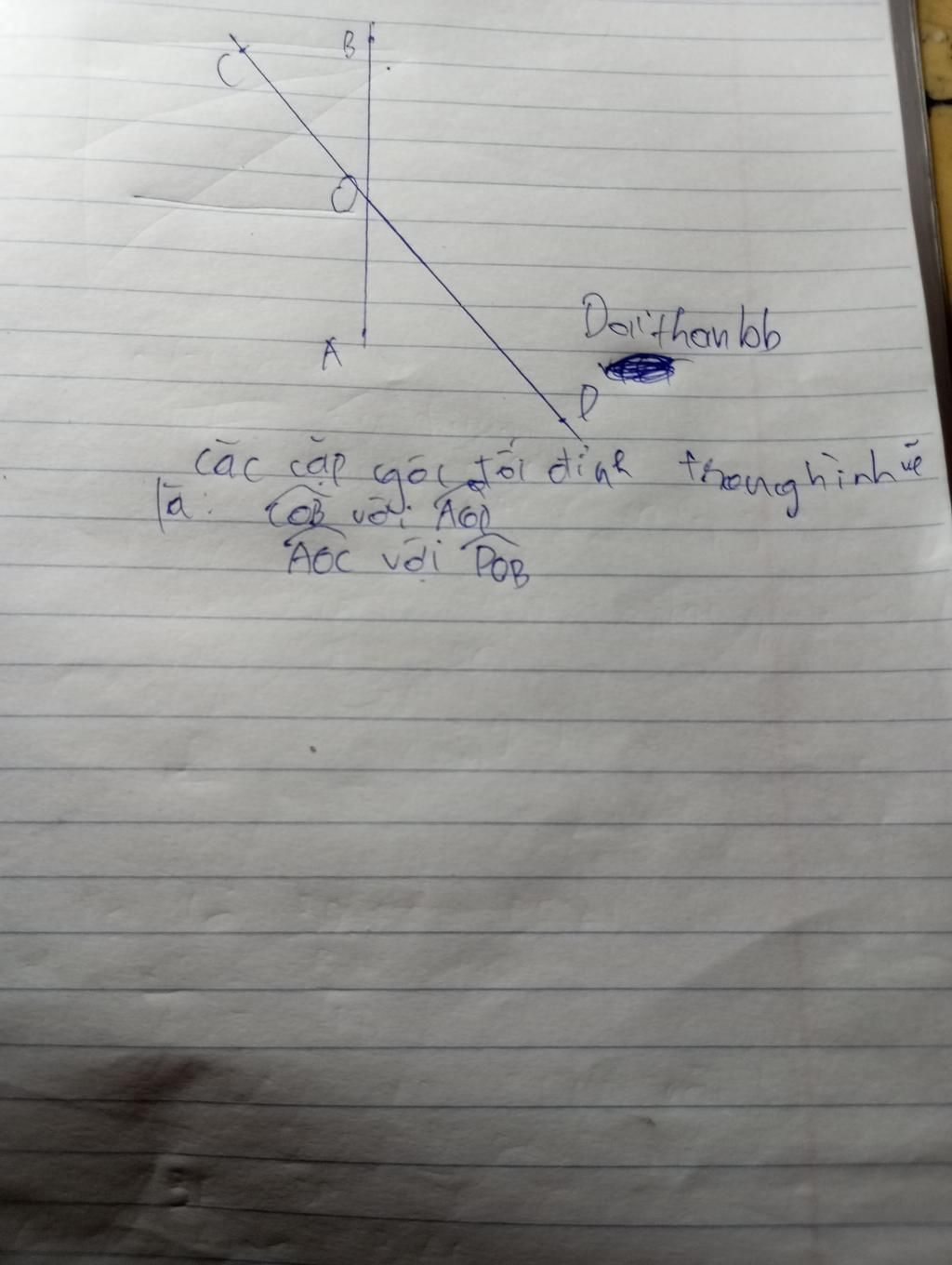 cho BÔD,vẽ AÔD kề bù BÔD,vẽ tiếp AÔC kề bù với AÔD.Kể tên các cặp góc dối đỉnh trong hình vẽ và giải thich vì sao?