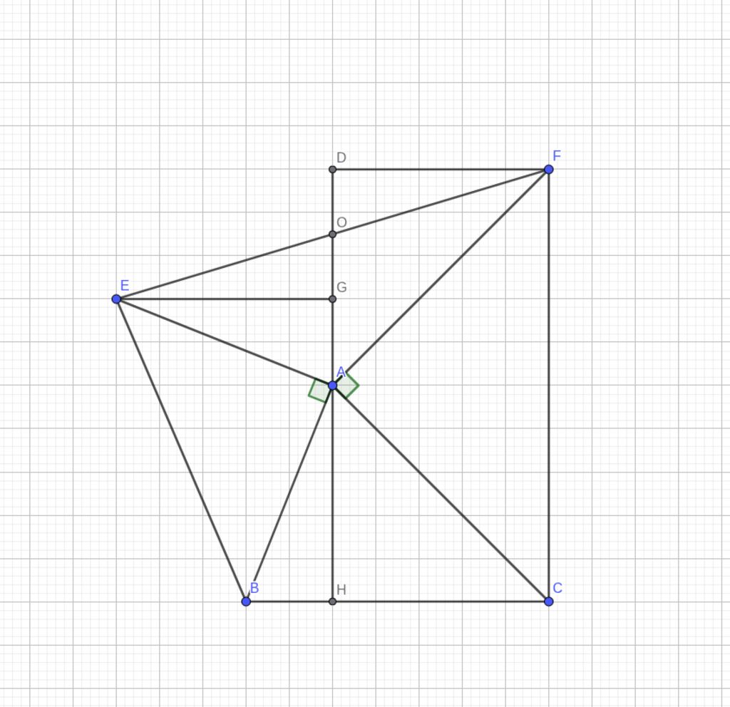 Cho ABC. Vẽ ra phía ngoài của tam giác này các tam giác vuông cân ở A là ABE và ACF. Vẽ AH BC. Đường thẳng AH cắt EF tại O. Chứng minh rằng O là trung điểm của EF.